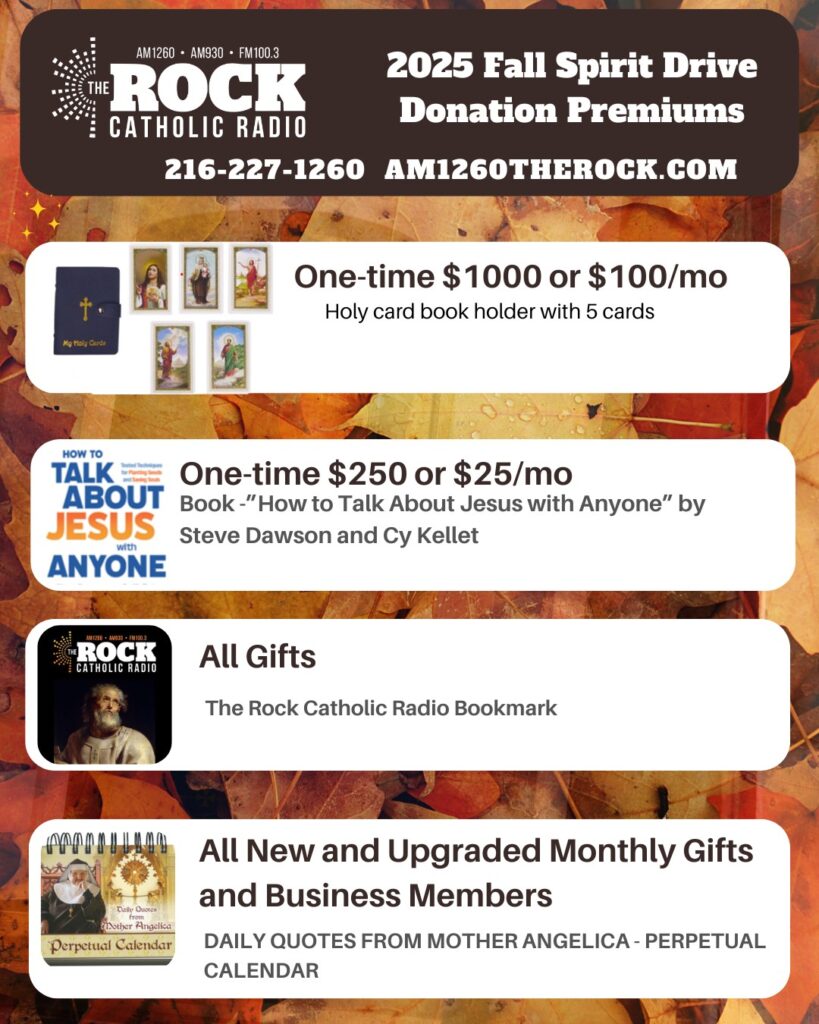 Twice per year, we come to you for help funding our apostolate. Our mission is to bring uplifting authentic Gospel teaching to the people in our listening area. We want to inspire conversion of heart and bring everyone to Jesus Christ through our broadcasting. Over the years, The Rock has changed the lives of many who found it by channel surfing, through the bumper magnets on your cars, or even through your shared social media posts.