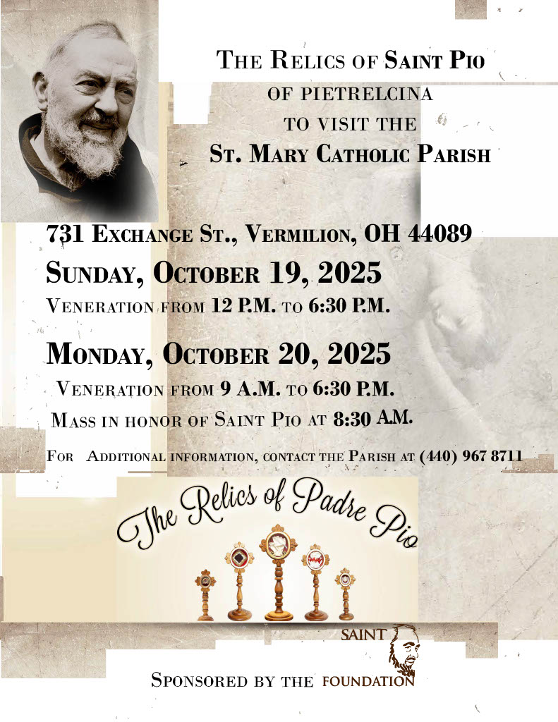 St. Pio (Padre Pio) Relic Event with 40 hour Adoration Devotion   The Relics of Saint Pio of Pietrelcina to visit the St. Mary Catholic Parish 731 Exchange St., Vermilion, Ohio 44089 Sunday, October 19, 2025: Veneration from 12 pm to 6:30 […]