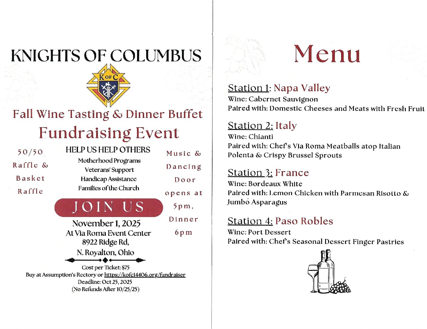 Event Description: Come and enjoy a 4 course dinner with a wine paired to each course at the Knights of Columbus Council 14406 Fall Wine Tasting & Dinner Buffet. Proceeds […] |